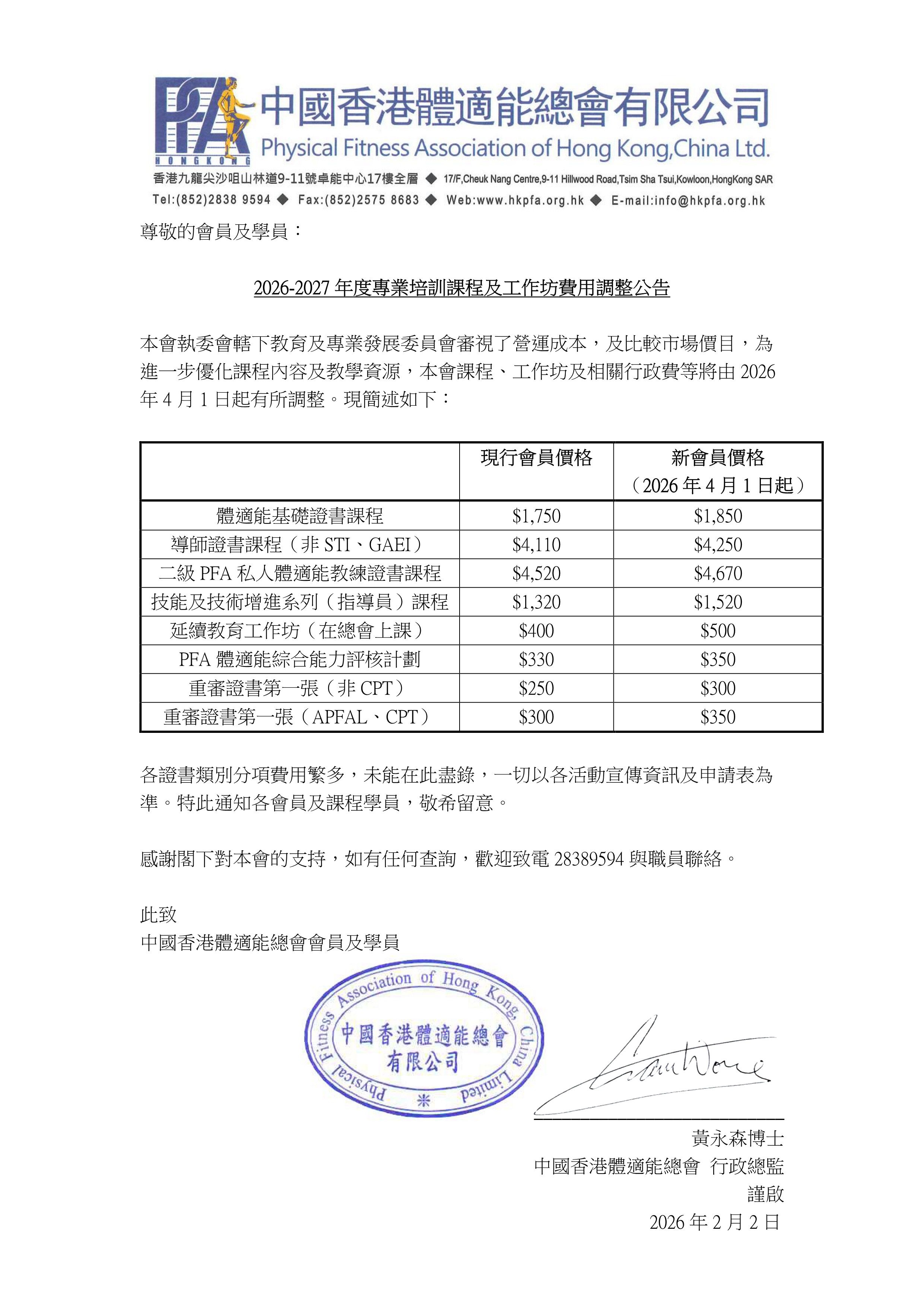 2026-2027年度專業培訓課程及工作坊費用調整公告