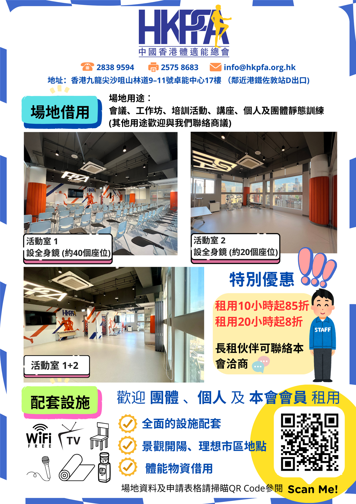歡迎團體、個人及本會會員租用,租用詳情可掃瞄單張內QR Code或聯絡本會查詢。